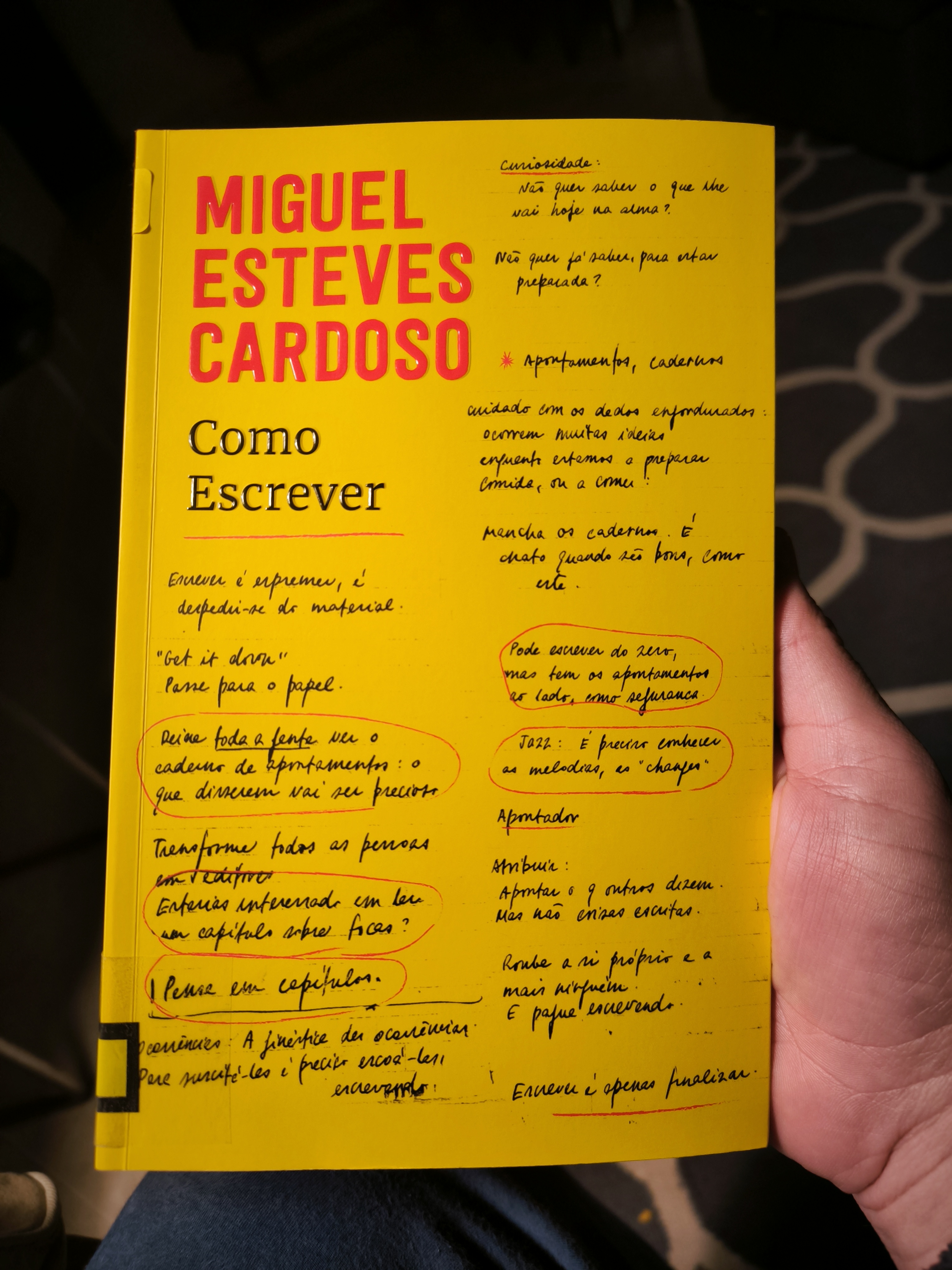 Li o mais recente livro do Miguel Esteves Cardoso, Como Escrever. Adorei-o, do princípio ao fim, repleto de lugares-comuns cheios de humor, sobre escrever, sobre processos, sobre a importância da palavra escrita. Gosto dos livros que me fazem rir no silêncio da leitura. Voltei a ser lembrado que podemos ser divertidos a falar de coisas sérias, sem perder a seriedade e utilizando algum humor como apontamento estilístico que pode reforçar ideias. Só tive pena de, sendo da biblioteca aqui do burgo, não ter podido seguir um dos conselhos iniciais: anotá-lo nas amplas margens. Teria ficado cheio de rabiscos, como eu gosto. E ainda para mais, tornar-me-ia num leitor-escritor enquanto o fazia. Mas o Miguel explica isso bem melhor do que eu.